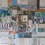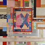 Kleurrijk abstract mixed media schilderij, opgebouwd uit diverse lagen (dekkend en transparant) en met verschillende materialen.