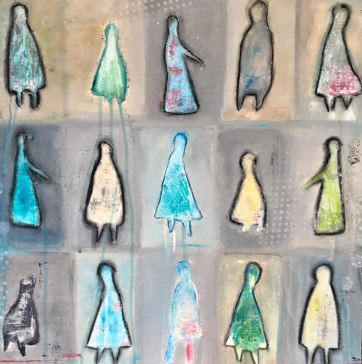Een globale impressie van het schilderij "Hokjes" 50x50cm.