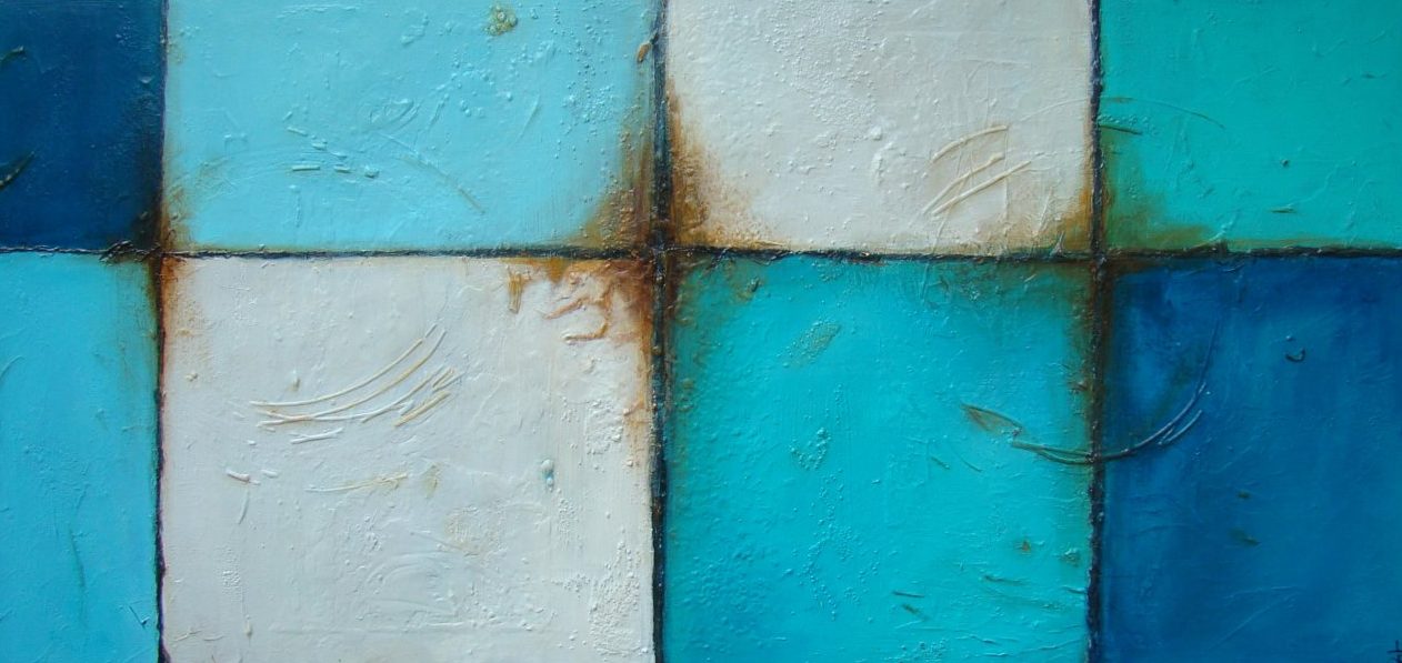 Acrylverf.Vlakken in blauw/groene kleuren, met veel nuances. Op het doek is veel gebruik gemaakt van strukturen waardoor het er diepte ontstaat.