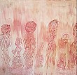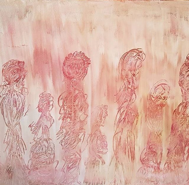 Een gelaagd schilderij, opgebouwd uit diverse lagen acryl verf en vervaagd met penseel. De figuren zijn met een paletmes gecreëerd. De silhouetten zijn intuïtief ontstaan. De kleur is licht oud roze.