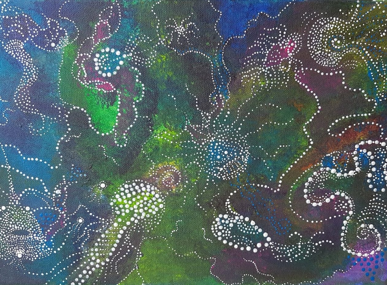 Een schilderij opgebouwd uit diverse lagen acrylverf, waarbij de kleuren in elkaar overvloeien. Daarna heb ik de lijnen gevolgd met een dot techniek, waarbij je kleine stippen maakt die vervolgens een eigen leven beginnen te leiden. Hier ontstond een onderwater beeld met allerlei (fantasie) zee dieren. Geschikt voor bijvoorbeeld een badkamer of kinderkamer.