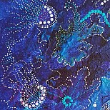 Groen en blauw zijn de hoofdkleuren van dit "onderwater" schilderij. De basis is opgebouwd uit laagjes acryl verf, aangebracht met verschillende technieken. Daarna zijn de lijnen en de fantasie dieren geboren door het volgen van de lijnen op het doek.