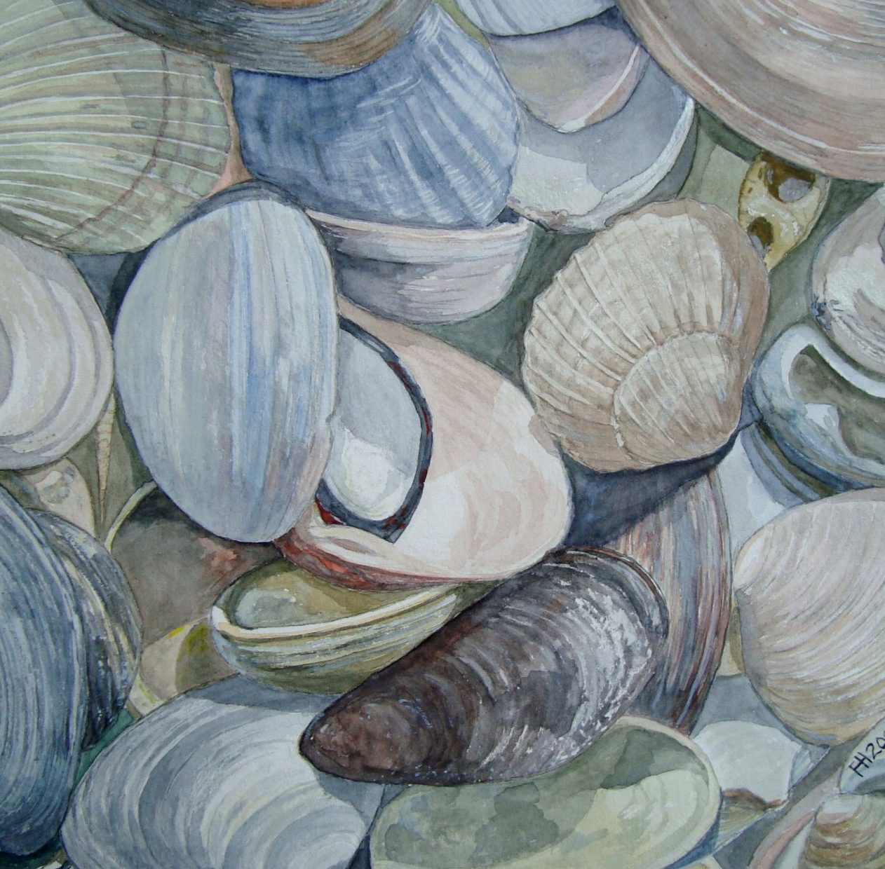 Een globale impressie van het schilderij "Schelpenpracht" 40x40cm.