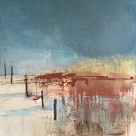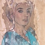 Mixed media op canvas doek (niet gespannen). Hangt mooi in houten latten met magneet aan boven- en onderzijde. Gelaagd werk met mooie blauwtinten.