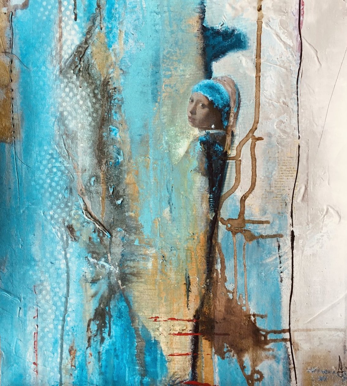Een globale impressie van het schilderij "Het meisje met de parel" 49x55cm.