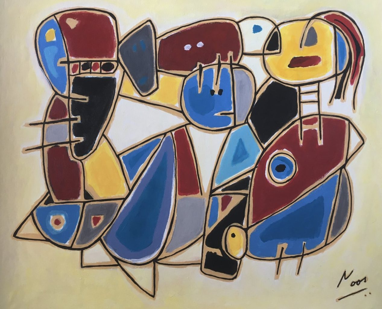 Acryl op linnen paneel. Werk in de stijl van de Cobrabeweging. Dit in de stijl van Corneille. Het werk wordt bij aflevering in lijst achter glas geleverd.