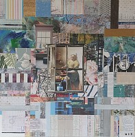 Modern abstract mixed media schilderij opgebouwd uit diverse lagen, dekkend en transparant en met verschillende materialen.