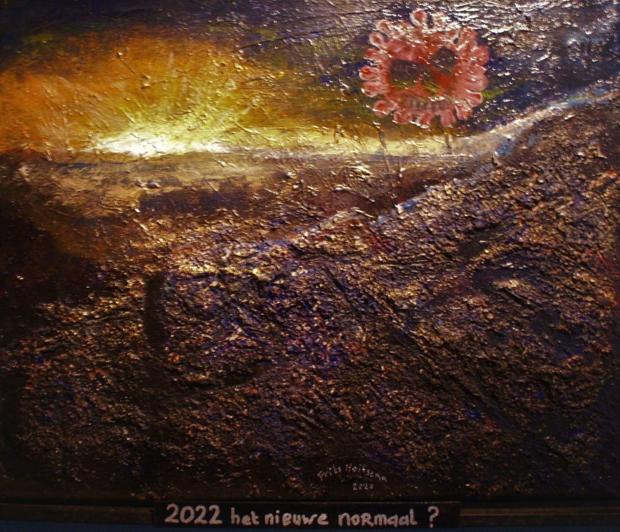 Een globale impressie van het schilderij "2022, het nieuwe normaal" 40x30cm.