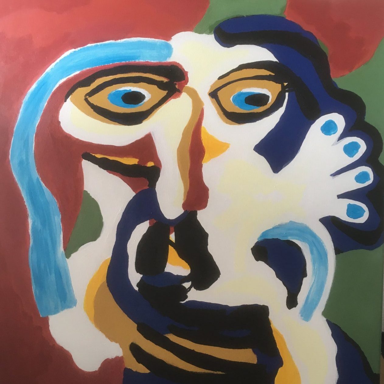 Een globale impressie van het schilderij "Kijk mij eens ( Karel Appel)" 73x73cm.
