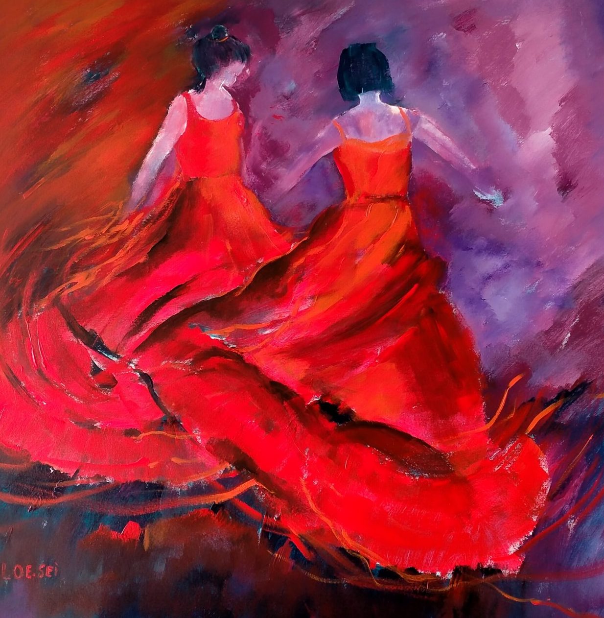 Een globale impressie van het schilderij "Rode dans" 100x100cm.