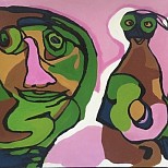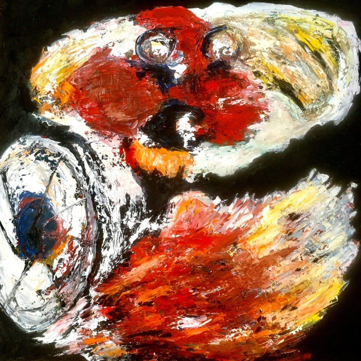 Een werkstuk naar Karel Appel zijn "Burning Child with hoop" uit 1961. Dikke Olieverf op katoenen doek. Afmeting schilderij is 80 x 80 Cm.