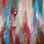 Groot schilderij, gemaakt met acrylverf op doek. Het heeft een frame dat niet kan kromtrekken. Het is abstractie gecombineerd met het vrouwelijk gelaat. Het is zeer expressief en de mysterieus.