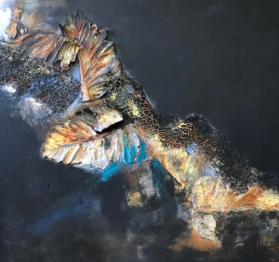 Mixed Media op 70×70 cm paneel, netjes afgewerkt met ophangsysteem.