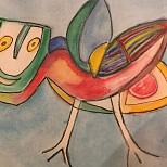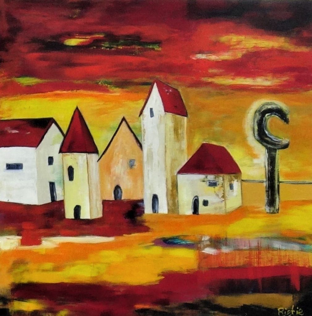 Een globale impressie van het schilderij "Er moeten mensen zijn die zonnen aan steken" 122x122cm.