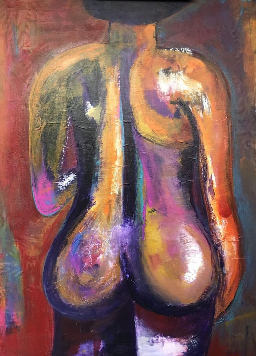 Een globale impressie van het schilderij "Myra je bent zo sprekend, jezelf" 60x80cm.