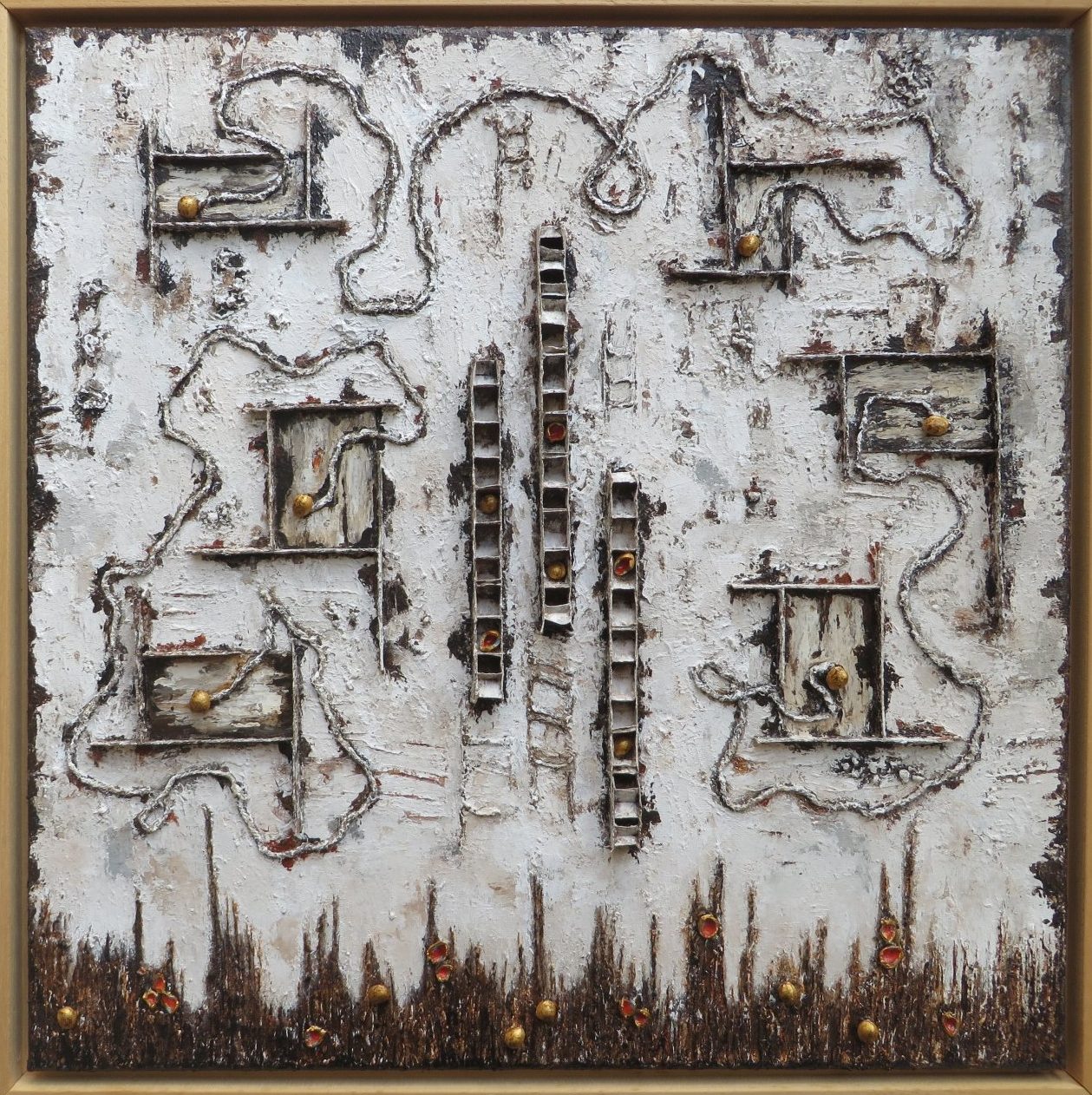Een schilderij in acylverf opgebouwd uit verschillende elementen zoals karton, wol en kersenpitten. Wordt in een blankhouten baklijst aangeboden.