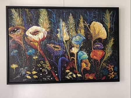 Een globale impressie van het schilderij "Flowers in the dark" 155x105cm.