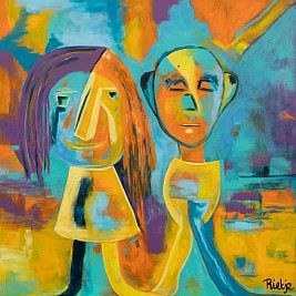 Een globale impressie van het schilderij "Blij met het kind in Mij" 122x122cm.