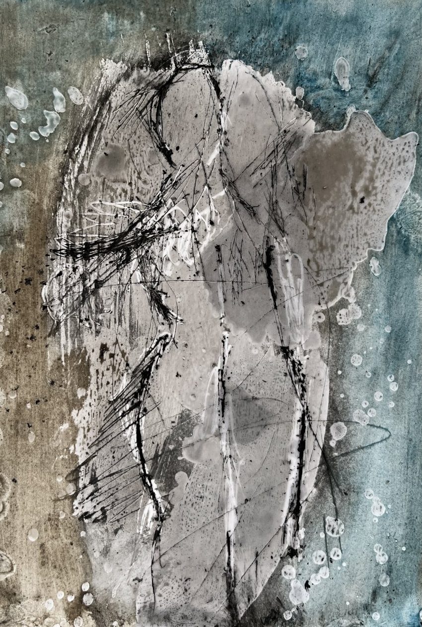 Mixed media (paraffine, pigmenten, inkt, acryl) op aquarel geplakt op paneel van 0,9 cm dik
