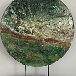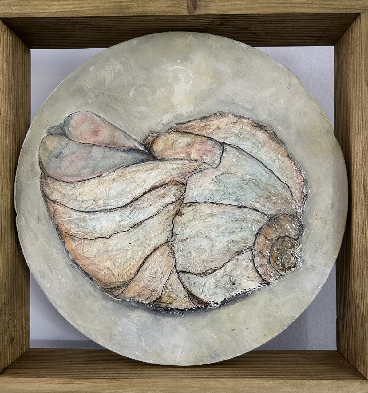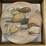 Materie schilderij/ mixed media/ rond mdf paneel in houten omlijsting/ acryl en ecoline/ 2zijdig bewerkt( geschikt voor roomdivider of vensterbank) andere zijde stenen in zand