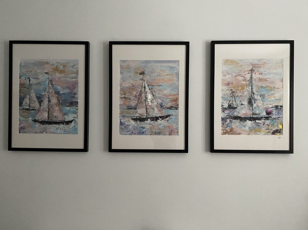 Acryl op papier met pass partout en zwarte lijst. Geïnspireerd door zeil race in Lanzarote. 3 luik . 3 x 50x70