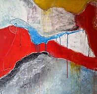 Kleurrijk werk van mixed media op linnen.