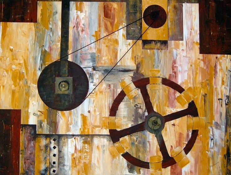 Oude Machine, geschilderd met acryl op linnen, met metalen applicaties, zoals o.a. fietsradertjes.