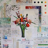 Kleurrijk, doch rustig abstract, modern, mixed media schilderij. Met doek op doek en hout, wat voor de nodige diepte zorgt. Compositie in 3D